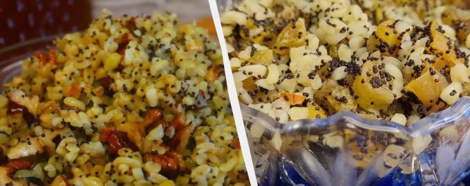 Ξεπλύνετε το πλιγούρι αρκετές φορές, γεμίστε το με νερό και μαγειρέψτε το για 15 λεπτά σε χαμηλή φωτιά. Αφήστε το πλιγούρι να κρυώσει κάτω από ένα καπάκι. Περιχύνετε με βραστό νερό τη σουλτανίνα και τον παπαρουνόσπορο για 30 λεπτά και ψιλοκόψτε τους ξηρούς καρπούς σε μικρά κομμάτια. Αλέθουμε τους σπόρους παπαρούνας με ένα μπλέντερ ή ένα γουδί. Στη συνέχεια ανακατεύετε τον χυλό με το μέλι και τα υπόλοιπα υλικά.
